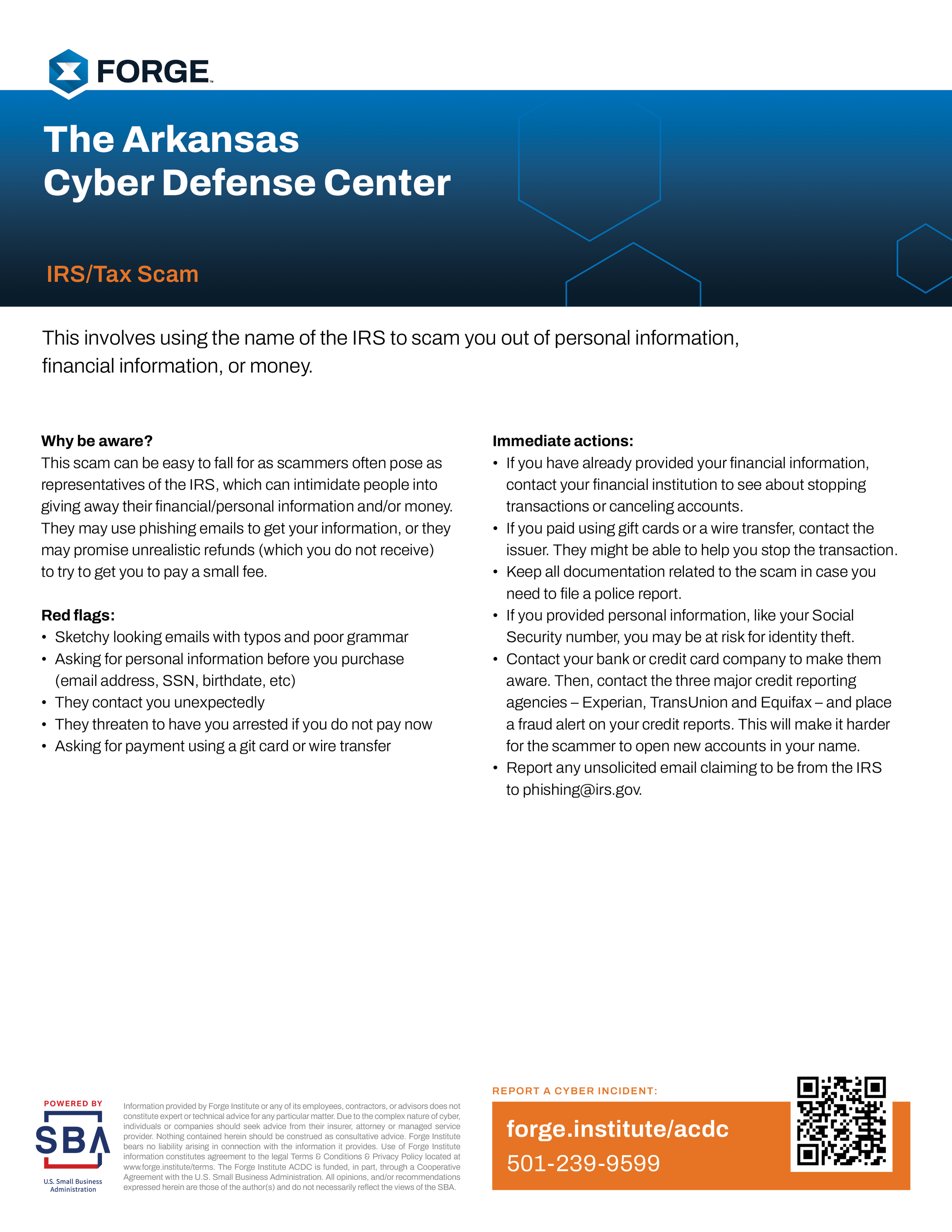 This involves using the name of the IRS to scam you out of personal information, financial information, or money.